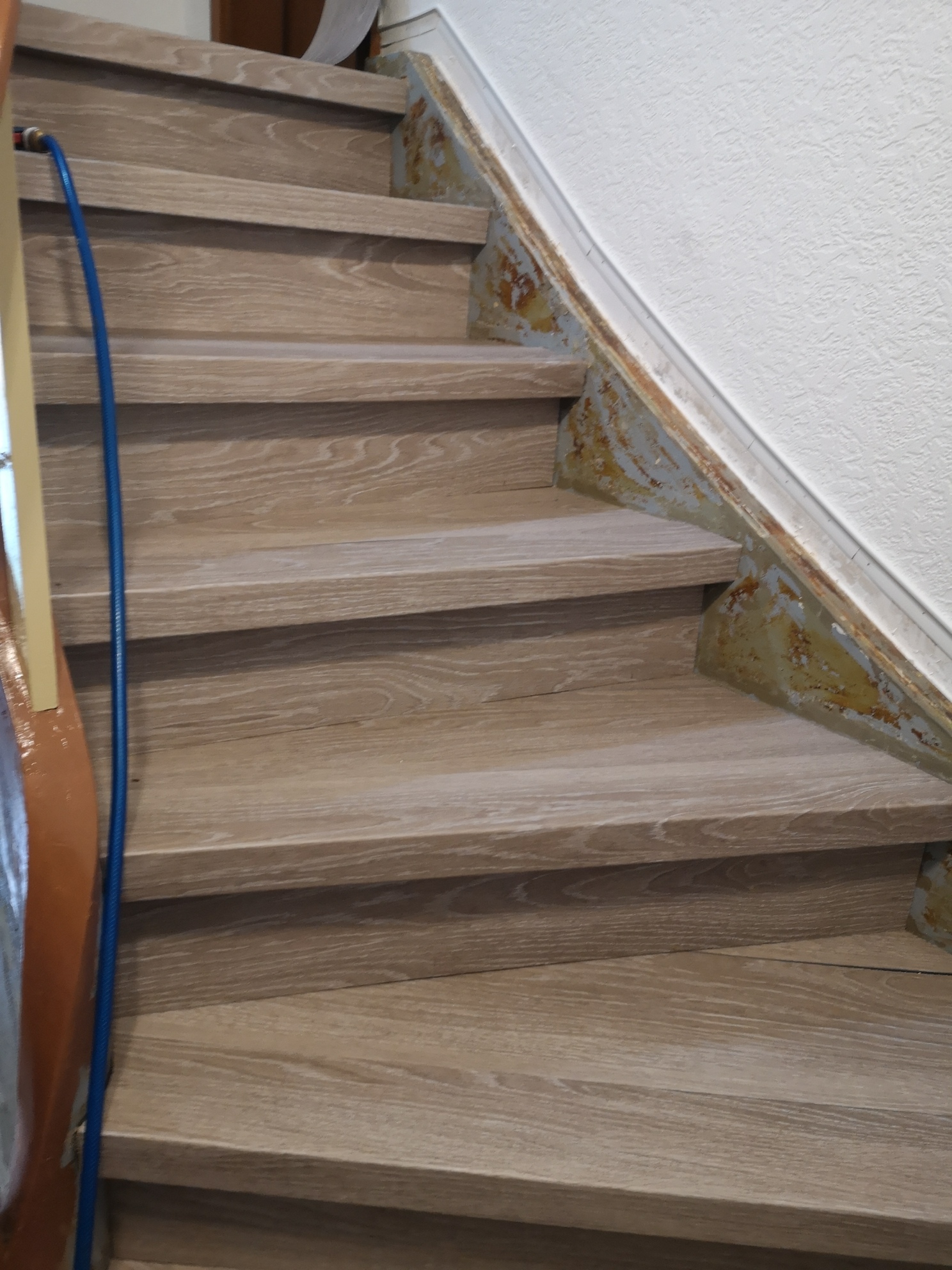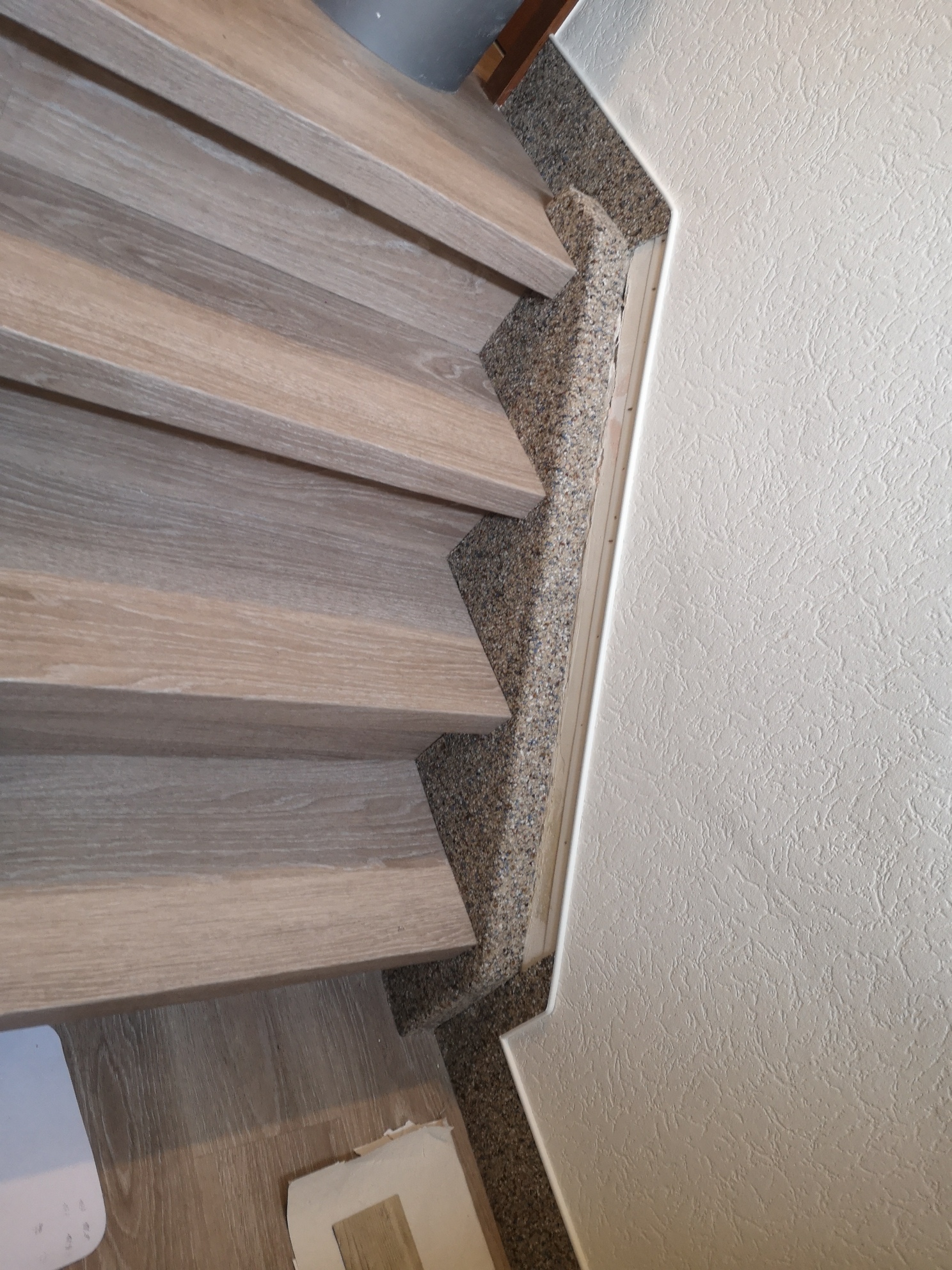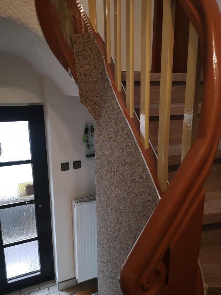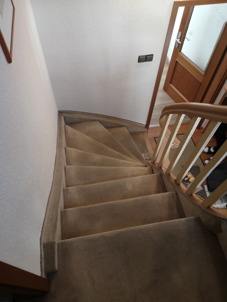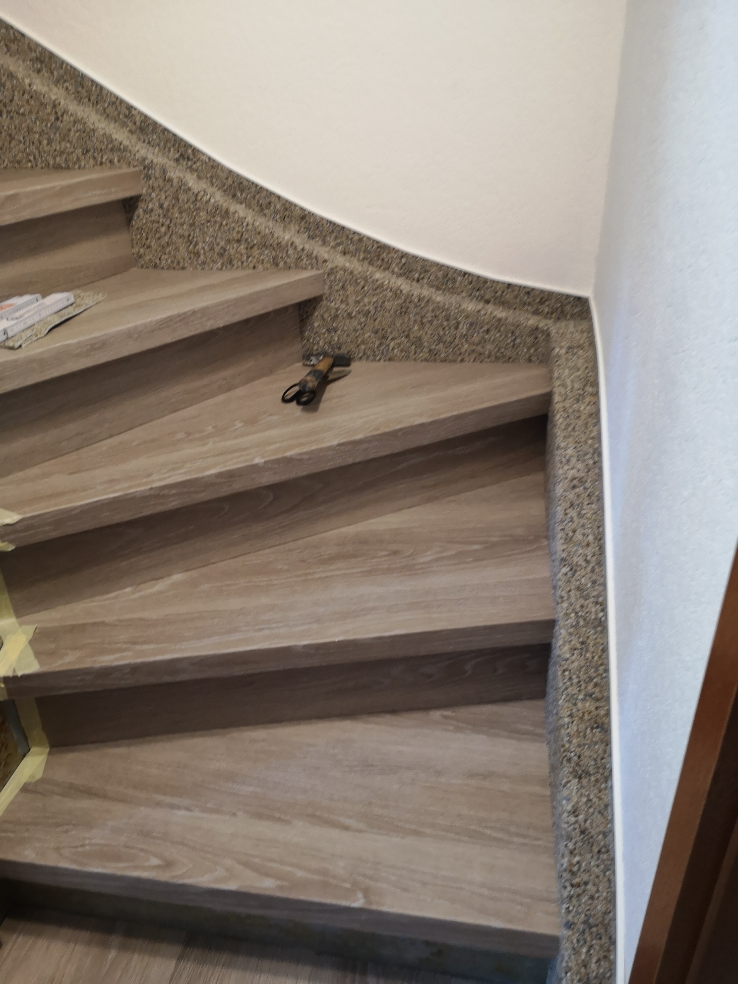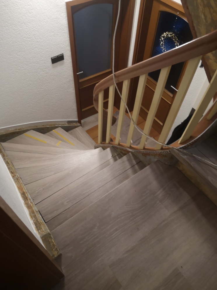 Aufgabenstellung : neu belegen einer Holztreppe über 2 Etagen. Teppichboden wird Vinylboden .