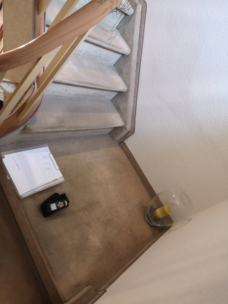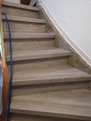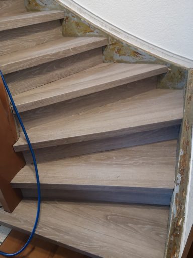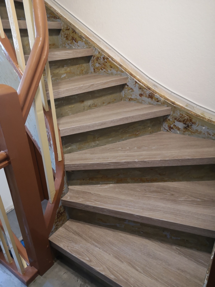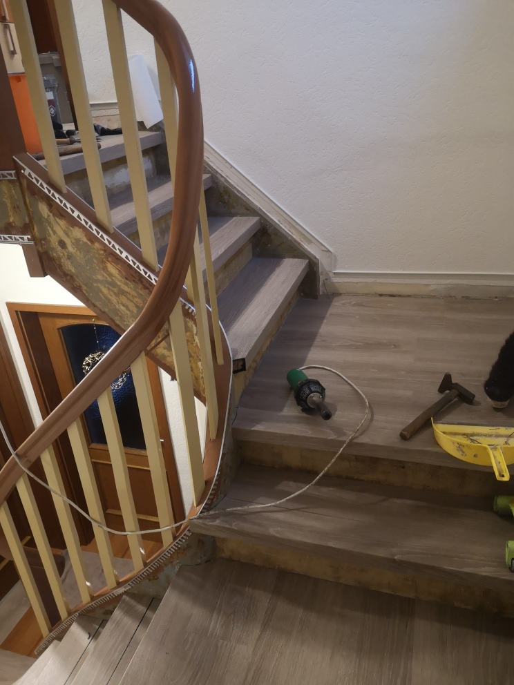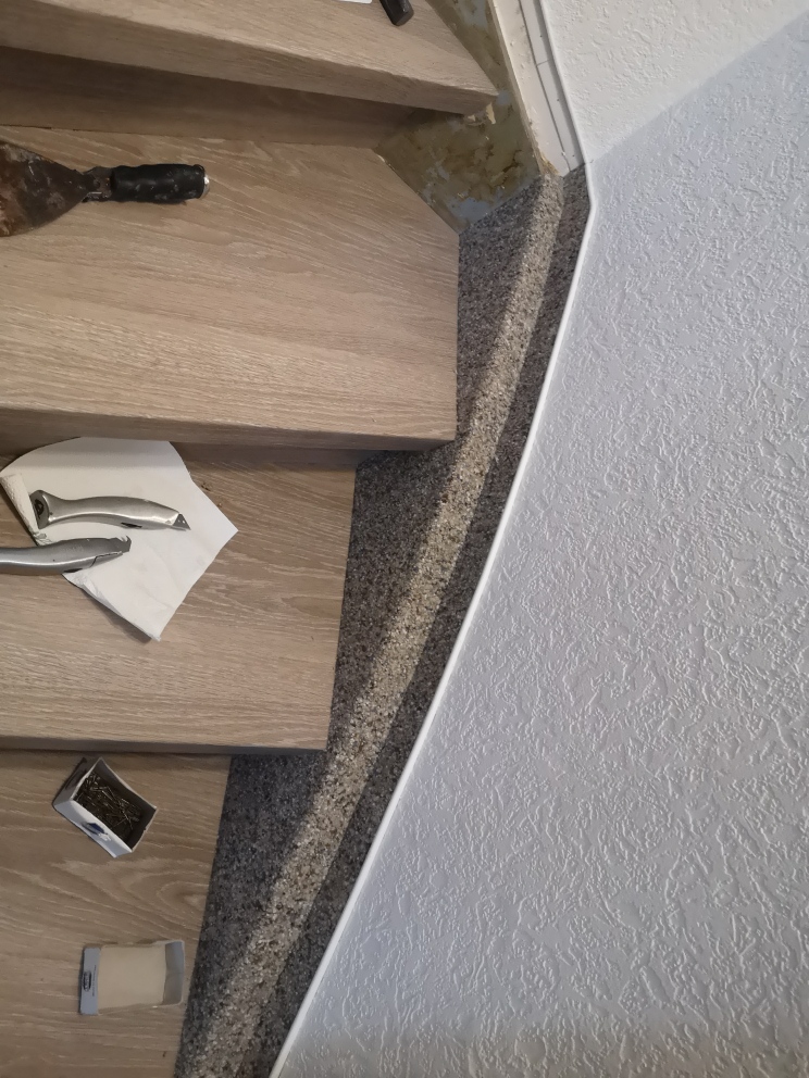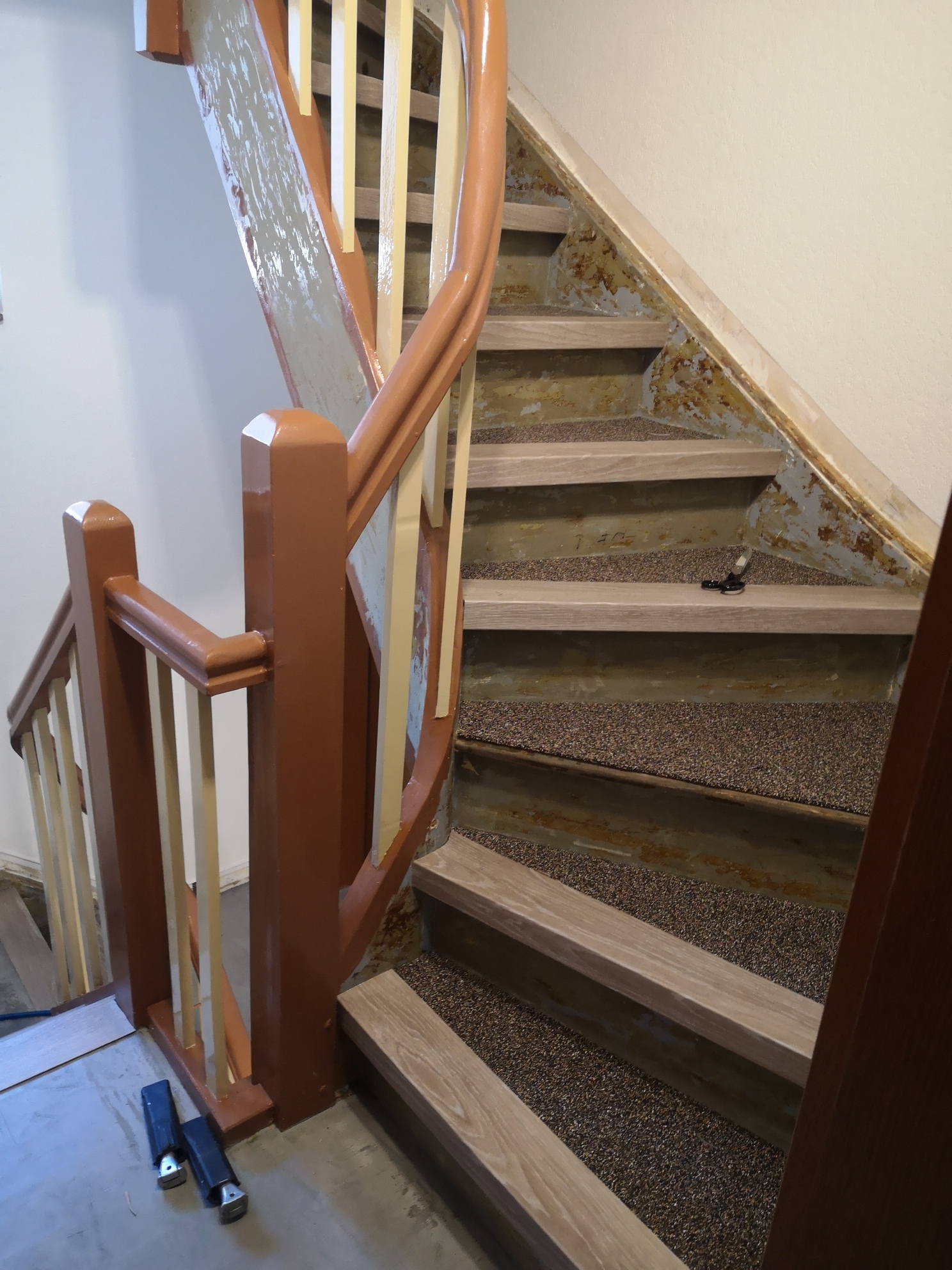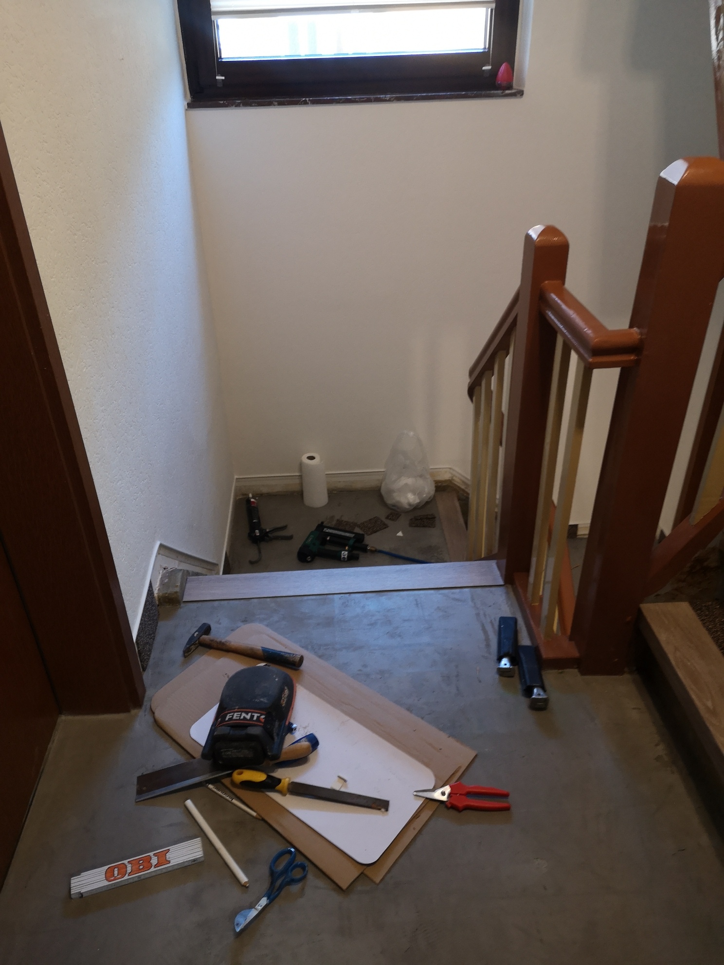 Aufgabenstellung : neu belegen einer Holztreppe über 2 Etagen. Teppichboden wird Vinylboden .